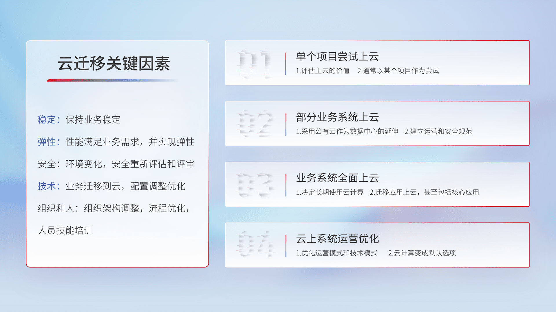结合实际业务,,从规划设计、、、、云平台选型、、、、云原生改造、、、数据迁移、、、集成交付,,,迁移全过程为客户识别最佳上云路径,,做好风险识别管理,,,设计网络架构、、、、身份权限、、安全审计合规、、、、操作审计、、日志审计、、、监控告警策略、、多站点容灾设计等,,,对云上基础设施进行整体规划,,,,提升IT治理水平,,,以满足弹性、、、、高可用、、高性能的需求。。
